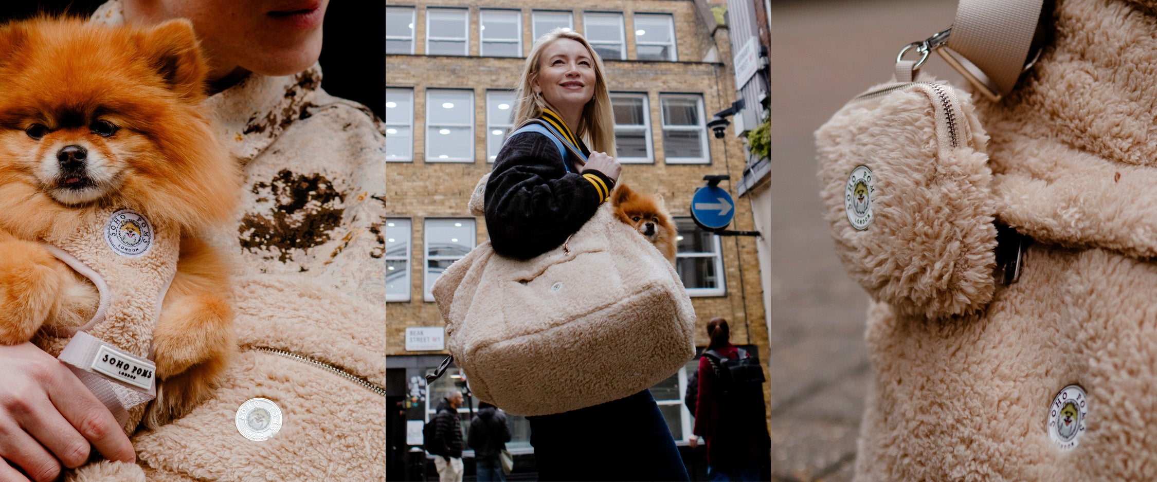 Soho Poms presents two distinctive collections inspired by the streets that shape its spirit. The Carnaby Collection draws from the bold, fashion-forward energy of Carnaby Street, bringing together teddy-textured luxury dog carriers with a full range of coordinated walking essentials. Designed for stylish city strolls and cosy weekend adventures, the range includes a matching walking bag, lead, harness, treat pouch and dog poo dispenser pouch, creating a complete, elevated look for dogs and their owners. Each piece blends comfort, practicality and unmistakable Soho style.